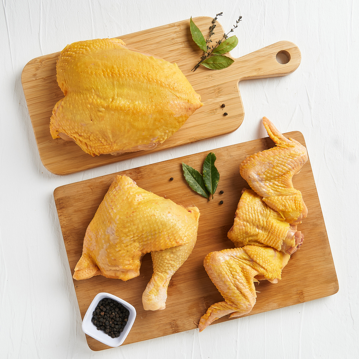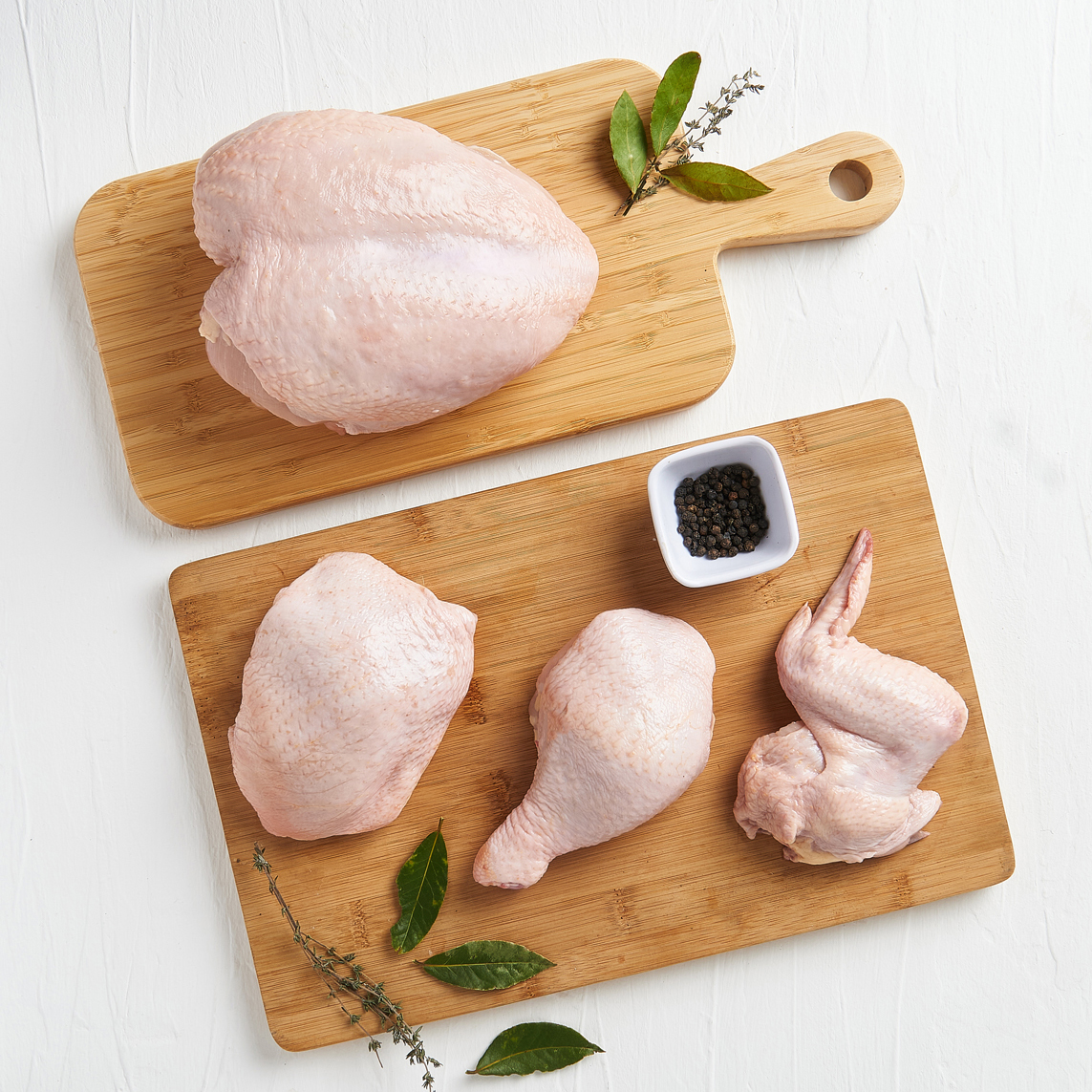 Pechuga (entera, deshuesada o en filete), Pierna Pernil, Alas, Muslo, Contra Muslo.